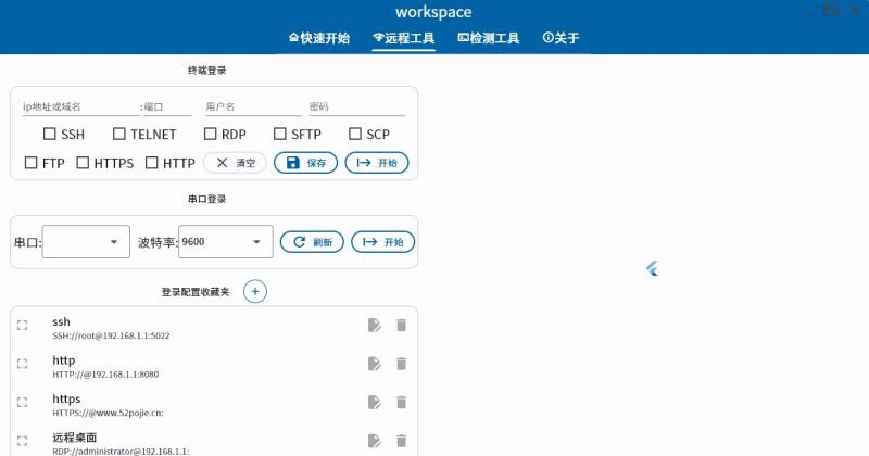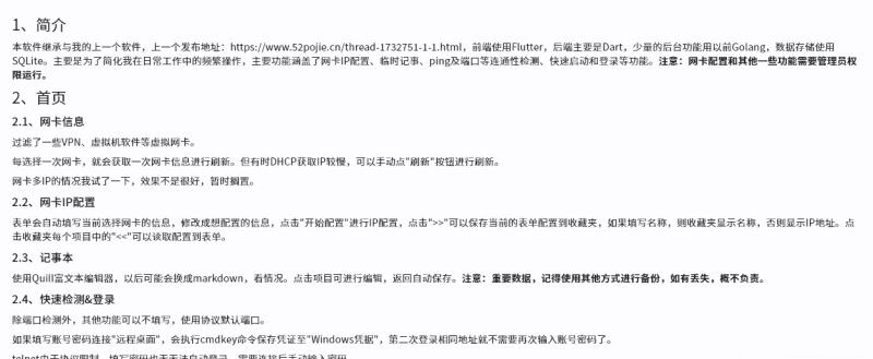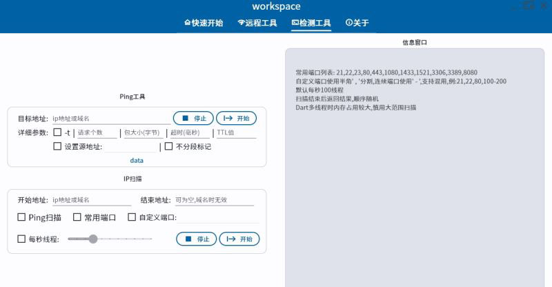 workspace软件中文版是一个集成修改网卡IP、网络扫描、记事本、快速启动的效率工具,前端使用Flutter,后端主要是Dart,少量的后台功能用以前Golang,数据存储使用SQLite。主要是为了简化我在日常工作中的频繁重复操作,主要功能涵盖了网卡IP配置、网络检测与扫描、记事本、快速启动和登录等功能,还有些功能没想好思路,以后慢慢来。