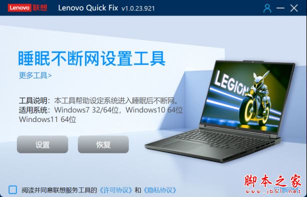 睡眠不断网工具在电脑中使用的软件,该软件是由联想出品在,支持设定系统进入睡眠后不断网,界面简洁,易于上手,本站提供了该软件的绿色版本,以及使用的方法,欢迎需要的朋友下载使用。