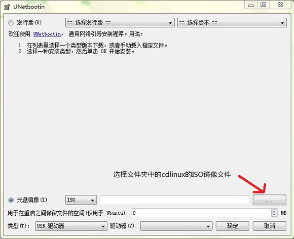 4、选择安装程序光盘镜像文件,然后点击浏览选择刚刚解压出来的CDlinux镜像文件