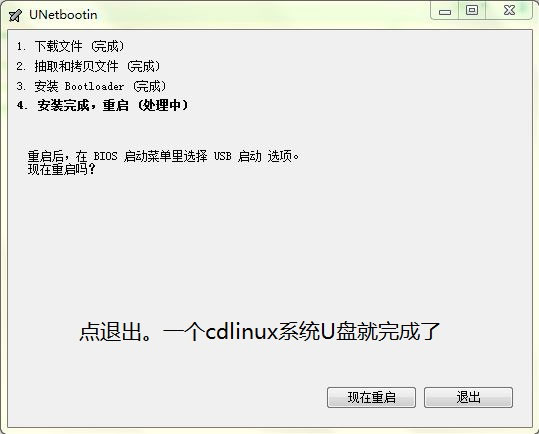 7、最后点击退出即可,此时CDlinux已经写入到U盘中了,此时重启电脑选择使用U盘引导即可进入CDlinux中了