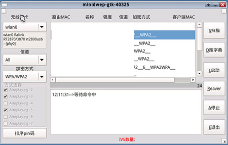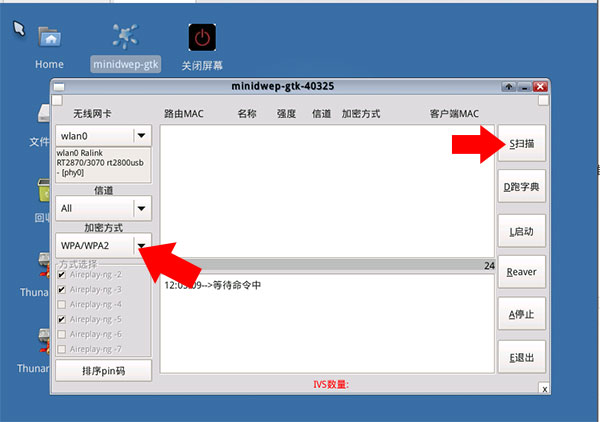 3、接下来我们双击打开CDlinux中的minidwep-gtk软件,将加密方式切换为wpa/wpa2,点击扫描等待一段时间
