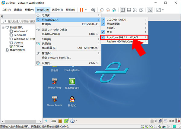 1、开启虚拟机,插上usb无线网卡此时VMware会提醒新USB设备,我们选择连接至虚拟机中的CDlinux中