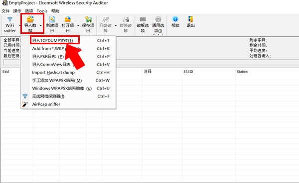 5、将握手包转移出虚拟机,放到本机上,打开EWSA软件,点击导入数据-导入TCPDUMP文件,然后选择刚刚导出的握手包文件,点击开始攻击即可