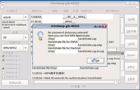 4、选择想破解的wifi,然后点击启动,等待一段时间之后就可以获得握手包,握手包文件默认在tmp/目录下