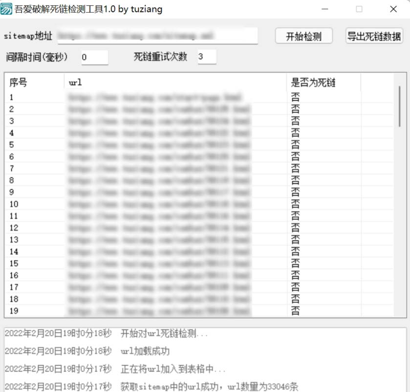 吾爱破解死链检测工具是一款网站站长收录死链一键检测利器,用于检测自己网站有否有死链,原理是根据你给定的sitemap.xml地址,正则提取出网站内容的每条url并发送请求,最后展示在窗口上。