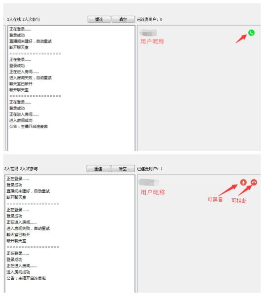 5、点击接通后,主播已接通粉丝的连线;当粉丝音质不好或暂时不需要发言时主播可点击静音按钮,此时该粉丝的发言将不会被播放,当连麦环节已结束时,主播可点击挂断按钮,结束与该粉丝的连麦