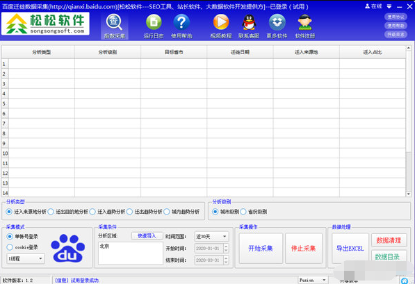 百度迁徙数据采集工具是一款可以帮助用户采集相关数据的应用软件,支持批量采集迁入来源地分析、迁出目的地分析、迁入趋势分析、迁出趋势分析、城内出行强度分析等多种格式的数据,欢迎需要此款工具的朋友前来下载使用。