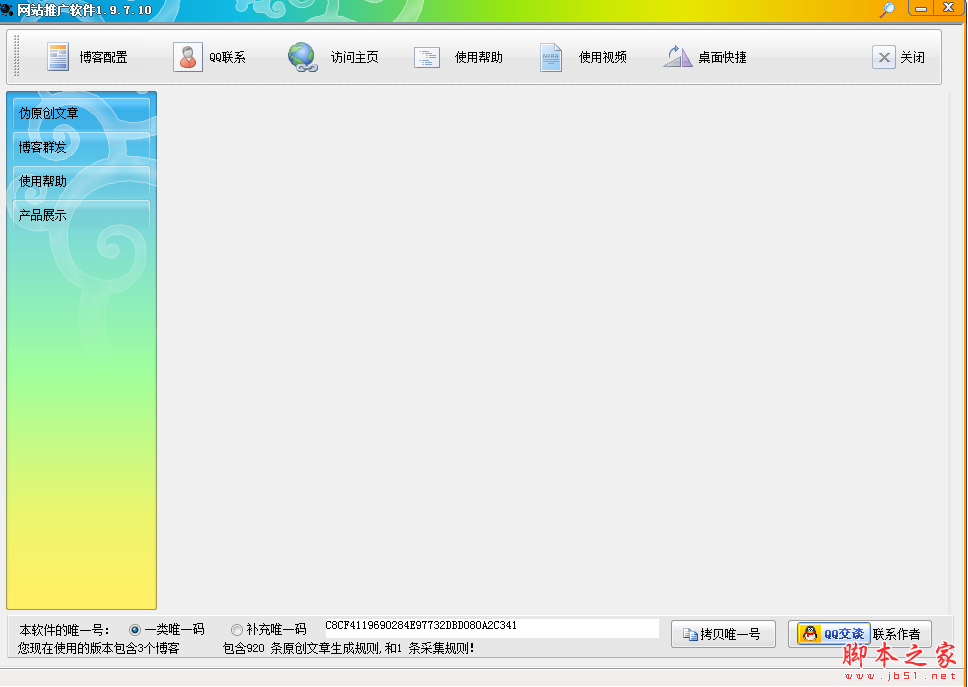 本软件是一款专业的网站推广工具。其主要工作原理是:通过大量群发高质量的博客,在博文中填写原创,或伪原创文章,并适当带上网站链接,来制 造有效外链。一般通过一段时间群发可以给网站带来可观的外链。通过这个方法来达到推广网站,提高网站在搜索引擎中的排名!