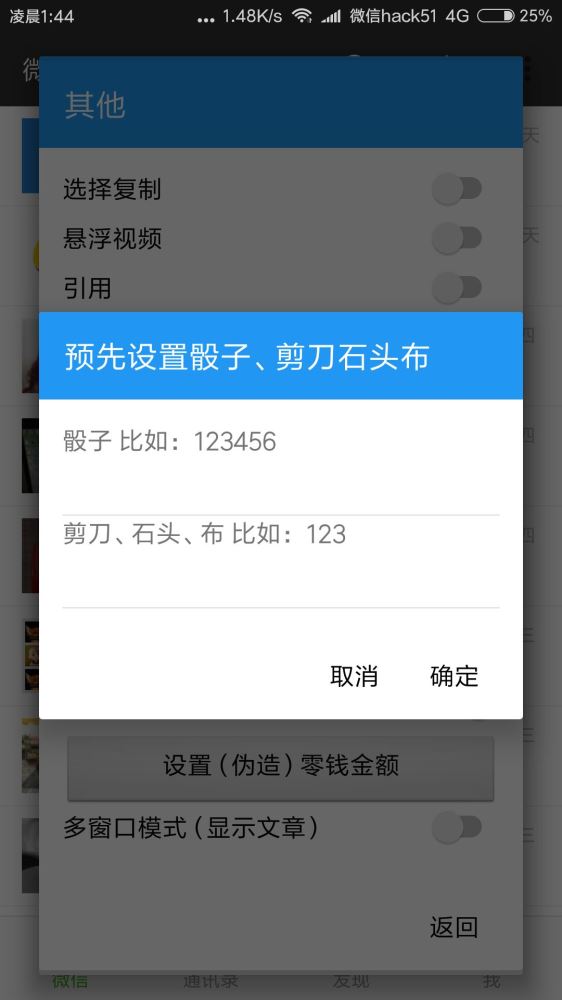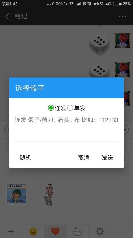 5.因为是插件控制官方微信,修改后的骰子,和正常微信骰子猜拳一模一样