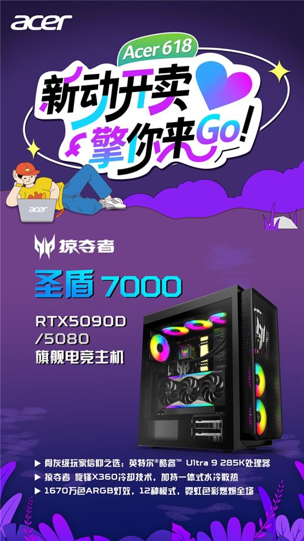 在高阶性能阵营中,掠夺者·战斧18 AI与掠夺者·圣盾7000分别代表宏碁在游戏本和游戏台机的性能巅峰。战斧18 AI搭载英特尔酷睿 Ultra 9 275HX处理器与NVIDIA RTX 5090旗舰独显,配合24GB显存、175W满功耗释放与1824 TOPS AI算力,助力AI创作与4K游戏全面满载;其18英寸Mini LED电竞屏支持4K 120Hz与FHD 240Hz双模切换、100% DCI-P3广色域与1000nit峰值亮度,并配备MagKey 4.0可替换键盘系统、双雷电5接口与超大拓展空间,全方位封顶性能与操控体验。圣盾7000至高搭载RTX 5090显卡,拥有24,576个CUDA核心、32GB GDDR7显存与高达4000 TOPS的AI算力,搭配英特尔酷睿 Ultra 9处理器,轻松驾驭光追游戏与专业级创作任务;360mm旋锋X冰霜散热系统、ARGB灯效定制与全景侧透玻璃机箱,共同打造散热与颜值兼具的旗舰主机平台。