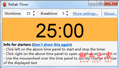 Reliak Timer是一款小巧易用的计时助手软件。该款工具可以详细的记录工作时间和休息时间,如果到时间了还会通过音乐或闪动视窗来提醒用户,为您提供更高效的作息时间。大大提高工作效率,喜欢的朋友快来下载吧 软件功能 1、支持简易的任务管理 2、支持番茄的日期统计 3、支持声音提醒 4、支持桌面通知提醒 5、支持窗口前置 6、支持迷你模式 Reliak timer 计时