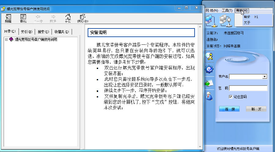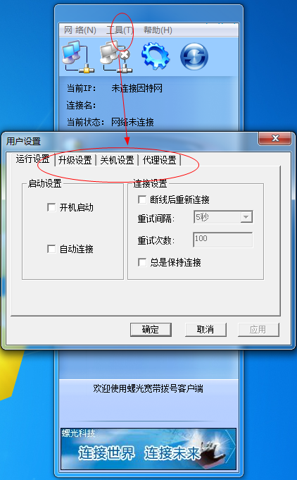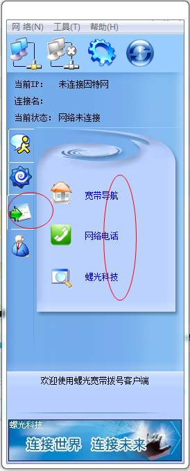 螺光宽带拨号客户端是一款专为国内广大宽带拨号用户定制的免费拨号软件。您可以将常用的软件添加到这里,进行分组保存。以后只需打开拨号客户端,就可以直接启动您的应用程序。 软件介绍: 螺光宽带拨号客户端内置的辅助功能,具有绿色无插件,拨号速度快,占用资源少,并可以设置自动运行,自动拨号,断线后自动重连,定时关机,拨号连接使用代理等功能。 使用说明: 1、可以点击【工具】进行一些相关的设置; 2、不知道怎么用,也是可以看这里的使用帮助的; 3、一些和宽带相关的设置的东西! 宽带拨号 螺光宽带拨号