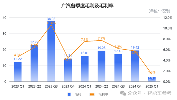 利润层面,广汽一季度毛利为2.71亿,毛利率只有1.4%,同比下滑了6个百分点。