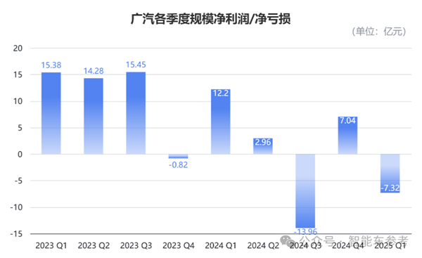 更关键的是,广汽Q1的归母净利润,延续了2024年年报的亏损走势,从去年Q1的12.2亿元净利,直接转亏为今年的7.32亿元净亏,同比大跌160%。