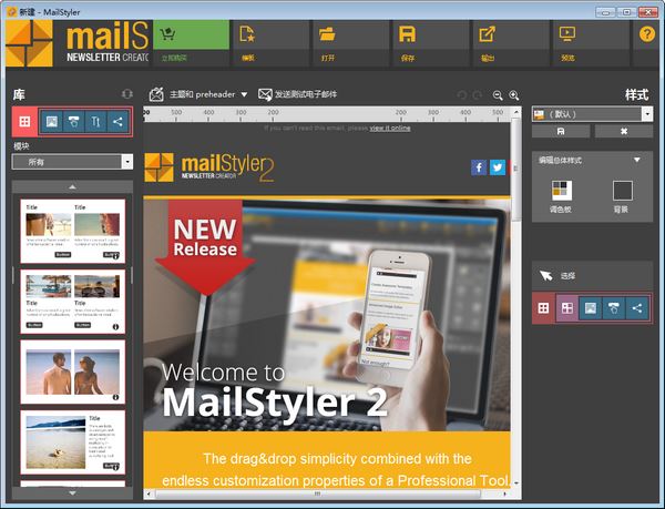 MailStyler 2(邮件模板编辑工具)是一款功能强大且好用的邮件模板编辑工具,通过软件用户可以快速的制作出属于自己的电子邮件并进行保存,非常方便。