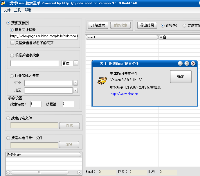 爱博Email搜索圣手是一款功能强大、简单易用、界面友好的高速定向电子邮件Email搜索工具,支持百度、Google邮件搜索,本地Email搜索和论坛邮件搜索。