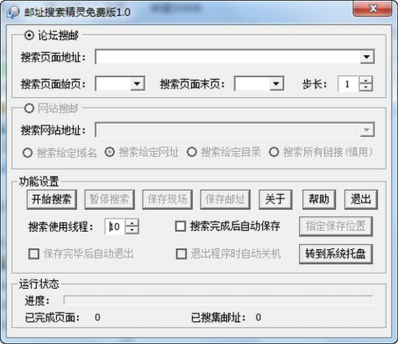 邮址搜索精灵是一款可以再论坛里搜索邮址的软件,邮址搜索精灵可以在选择搜索完成后 自动保存搜集到的邮址,保存完毕后自动退出,有着同类软件无法比拟的优势。 功能介绍 1.支持在论坛里搜集邮址。 2.增加了搜索过程中的控制功能。 3.可以随时暂停、继续搜索。 4.可以保存当前搜索现场以便下次恢复。 5.可以选择搜索完成后自动保存搜集到的邮址,保存完毕后自动退出,退出时自动关闭计算机等功能。 更新日志 1.修复BUG,新版体验更佳 2.更改了部分页面 邮址 搜索 精灵