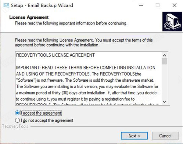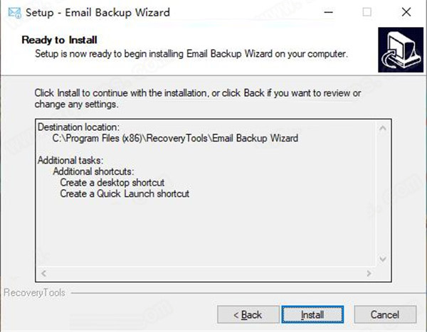 3、点击“Browse”可更改安装软件位置,安装向导默认设置的软件默认安装路径为C:\Program Files (x86)\RecoveryTools\Email Backup Wizard;