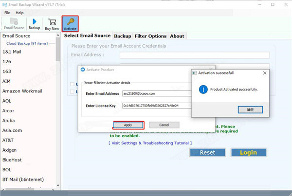 7、双击打开Email Backup Wizard软件,点击Activate,将注册码.txt文件下的注册码复制到软件对应位置,点击Apply;