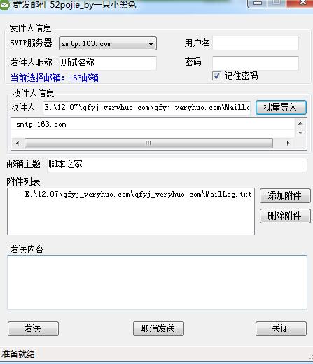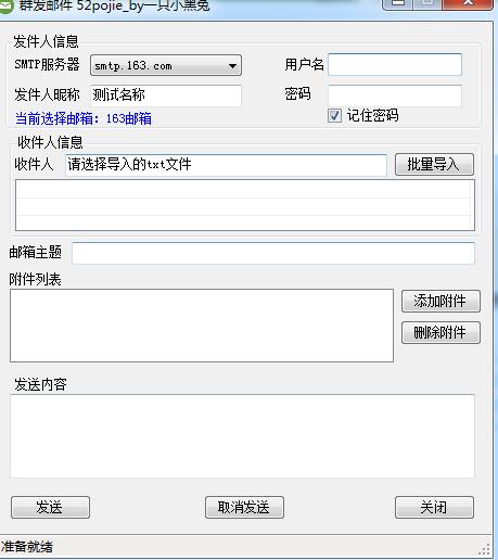 吾爱邮件群发软件是一款能够帮助用户快速将邮件发送给多个用户的工具,软件支持导入收件人、随意修改发送地址等,需要的朋友可以前来本站下载。 软件功能 1、能够批量导入收件人 2、随时改变SMTP服务器的地址 3、也是本软件最大的功能了:能够群发邮件 吾爱 邮件群发 群发邮件
