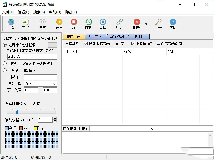 建议搜索之前先用浏览器浏览要搜索的网站,找到最容易搜索的、链接得到地址较多的页面作为开始页面,确定好邮件地址大部分处于第几层,能用参数搜索的最好使用参数搜索。