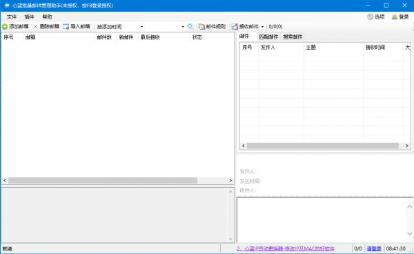 心蓝批量邮件管理助手是一款简单易用的邮件管理工具,软件旨在帮助您集中管理您的所有邮箱,当您使用多个邮箱时,该程序可以很好的辅助您接收与管理所有的邮件,其具备了简单直观的操作界面,您可以快速添加您的邮箱到列表中,软件允许接收所有的邮箱邮件,也可以仅接收所选中的邮箱,而且其内置了邮件过滤、邮件搜索、邮件匹配等多种基本功能,从而方便您更轻松的管理,值得一提的是,该程序有效支持qq/163/sina/Gmail/Hotmail/Outlook等大部分常见的邮箱。