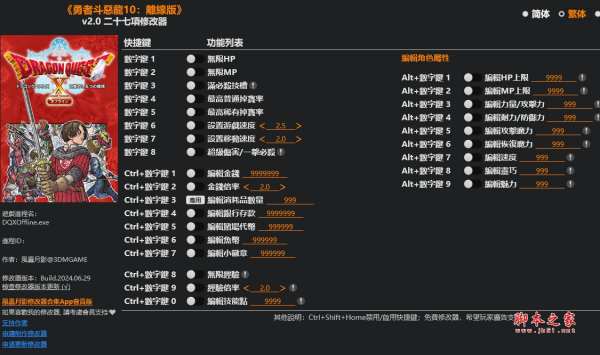 勇者斗恶龙10离线版二十七项修改器由作者“风灵月影”制作,勇者斗恶龙10是由Square Enix制作发行的系列角色扮演游戏,其内共有二十七项修改功能,包括满必杀技槽、编辑金钱、设置游戏速度以及编辑技能点等等,帮助玩家在这个世界里更好的冒险养成,极大地简化战斗过程,不用为升级资源而担心,各种BOSS敌人也能轻松击败,体验完整的故事剧情,轻松享受整个游戏,对此感兴趣的小伙伴快来下载试试吧。