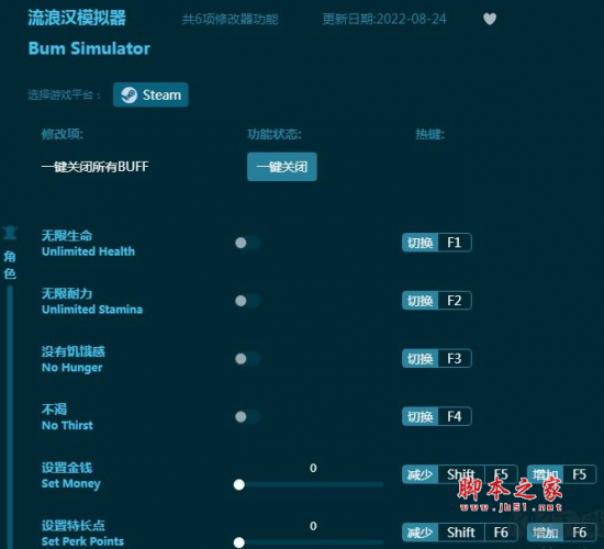 流浪汉模拟器六项修改器由作者“MrAntiFun”制作,流浪汉模拟器是一款由Alleyway Games打造的模拟冒险游戏,在游戏中玩家将扮演一名落魄的流浪汉,修改器具有无限生命,无限体力,不会饥饿,不会口渴,无限金钱等功能,喜欢的玩家千万不要错过下载哦。