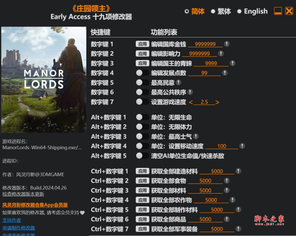 庄园领主Early Access十九项修改器由作者“风灵月影”制作,庄园领主玩家将体验到城市建设、战斗、经济和贸易等不同方面的挑战和乐趣,修改器具有无限生命,无限体力,最高士气,快速杀敌,无限商品等功能,喜欢的玩家千万不要错过哦。