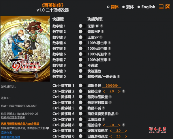 百英雄传二十项修改器由作者“风灵月影”制作,英雄传是一款经典的日式角色扮演游戏,修改器具有无限HP,无限MP,无限SP,100%暴击率,不遇敌等功能,喜欢的玩家千万不要错过哦。
