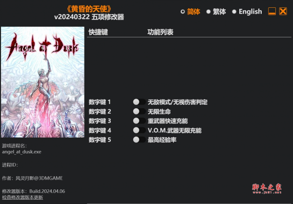 黄昏天使五项修改器由作者“风灵月影”制作,黄昏天使游戏中,玩家需要躲避炮火、抢夺道具、击退成群敌人,修改器具有无限生命,重武器快速充能,无视伤害判定,武器无限充能等功能,喜欢的玩家千万不要错过哦。 功能按键 数字键1-无敌模式/无视伤害判定 数字键2-无限生命 数字键3-重武器快速充能 数字键4-V.O.M.武器无限充能 数字键5-最高经验率 使用方法 1.解压文件 2.启动游戏 3.启动修改器 黄昏天使 修改器 无限生命 无限充能