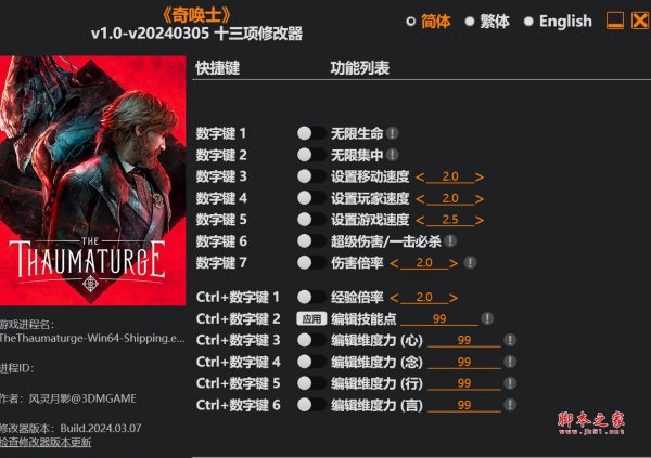 奇唤士十三项修改器由作者“风灵月影”制作,奇唤士是一款故事驱动的RPG游戏,玩家需做出道德角度难以界定的选择,修改器具有无限生命,无限集中,一击必杀,伤害倍率,经验倍率等功能,喜欢的玩家千万不要错过哦。
