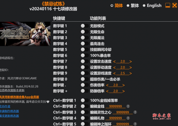 禁忌试炼十七项修改器由作者“风灵月影”制作,禁忌试炼是一款Roguelike角色扮演动作游戏。玩家将通过爽快的战斗,寻找到诸神黄昏的真相,修改器具有无限生命、无限魔法、最高连击、技能瞬间冷却、100%暴击率等功能,喜欢的玩家千万不要错过哦。