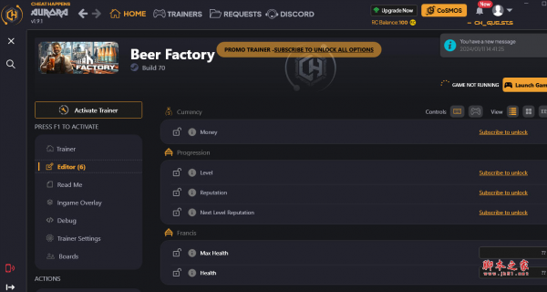 啤酒工厂八项修改器由作者“CHEATHAPPENS”制作,啤酒工厂是一款允许玩家经营自家酒厂的第一人称视角模拟经营游戏,修改器具有无限冲刺,无限金钱,最大生命值,游戏速度等八项功能,喜欢的朋友快来下载吧。 修改器功能 小键盘1:无限冲刺 小键盘2:游戏速度 编辑金钱 编辑关卡 编辑名誉 编辑下一级名誉 #弗朗西斯 最大生命值 生命值 使用说明 1.解压文件 2.启动游戏 3.启动修改器 特别说明 本修改器为Promo版本,完整功能需订阅。 啤酒工厂 修改器 无限冲刺 无限金钱
