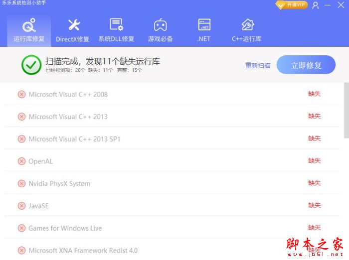 乐乐运行库修复助手是一款实用的修复类工具,可以自动检测电脑内缺少或损坏的运行库文件并修复。产品拥有最大最全的运行库文件库,提供包括DirectX、Microsoft.NET Framework、Microsoft Visual C++等在内的多种运行库 文件下载服务。