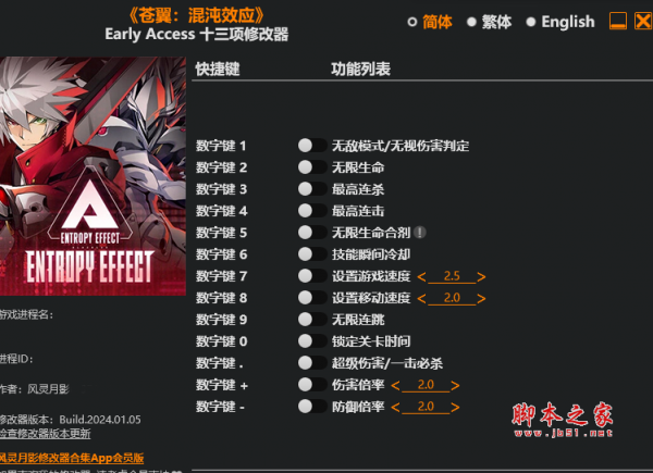 苍翼混沌效应十三项修改器由作者“风灵月影”制作,苍翼混沌效应是一款提供了充满刺激和极致体验的格斗体验游戏,修改器具有无限生命,最高连杀,最高连击,无限生命合剂,技能瞬间冷却等十三项功能,喜欢的玩家千万不要错过哦。