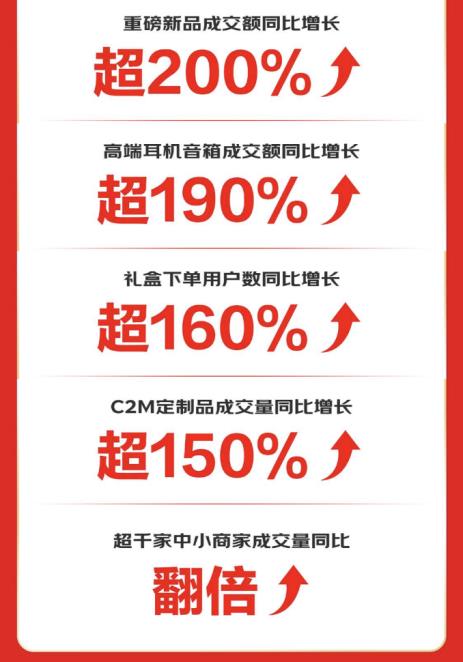 新品展示出了强劲的消费带动能力。京东618期间,耳机音箱重磅新品成交额同比增幅超200%。同时,高端耳机音箱迎来成交额同比增长超190%的战绩,在“情绪经济”趋势下,耳机音箱礼盒下单用户数也迎来同比超160%的亮眼增长。而基于对消费者需求的精准把握,C2M定制产品成交量也取得同比超150%的增长战绩。此外,超千家中小商家在京东618实现了成交量同比翻倍增长。