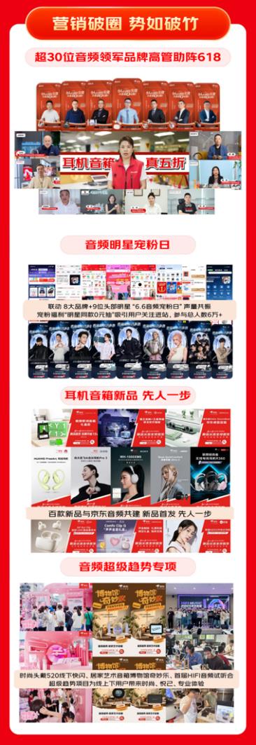 京东618期间,品牌与京东也实现了深度共建,推动超百款耳机音箱新品“先人一步”首发落地,覆盖开放式耳机、时尚头戴、艺术音箱、HIFI音频产品等多品类。同时,活动期间,超30位品牌高管助阵,京东还联动8大品牌与9位头部明星打造的“音频明星宠粉日”吸引超6万人热烈参与。此外,时尚头戴520线下快闪、居家艺术音箱博物馆奇妙乐、首届HIFI音频试听会等主题营销活动,也将文化体验与消费场景深度融合。