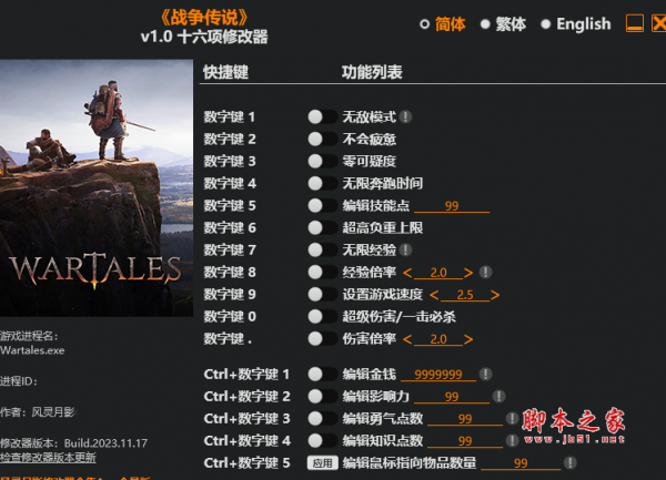战争传说十六项修改器由作者“风灵月影”制作,战争传说是一款中世纪背景开放世界角色扮演游戏,带领一群并非高大尚的角色,探索庞大严酷的世界寻求恶名与财富,修改器具有无敌模式,不会疲惫,零可疑度,无限奔跑时间,无限经验,超高负重上限等十六项功能,喜欢的玩家千万不要错过哦。