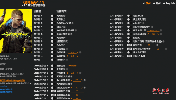 赛博朋克2077三十五项修改器由作者“风灵月影”制作,赛博朋克2077是一款跨世纪的角色扮演游戏,修改器具有无限生命,无限体力,无限物品,无需装弹,无后坐力等三十五项功能,喜欢的玩家千万不要错过哦。
