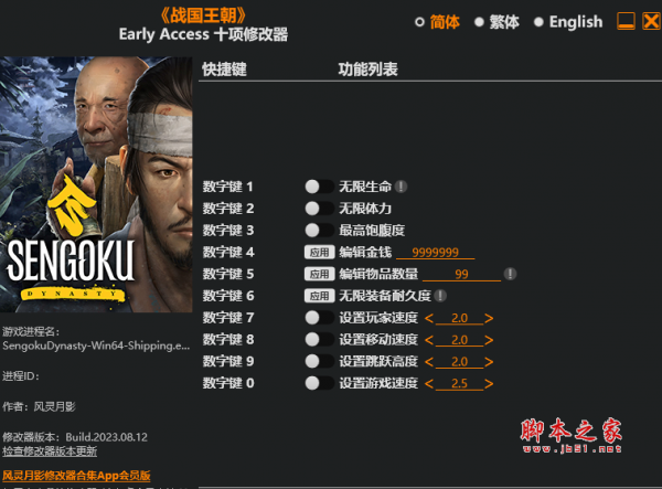 战国王朝十项修改器由作者“风灵月影”制作,战国王朝是一款多题材游戏,结合了开放世界RPG、城市建造和生活模拟以及生存元素,修改器具有无限生命,无限体力,最高饱腹度,无限装备耐久度等十项功能,喜欢的玩家千万不要错过哦。