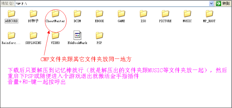 1.第一步和2000安装方法一样,将金手指文件夹(CheatMaster)和sepluins文件夹复制到psp的根目录下。