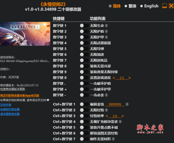 永恒空间2二十项修改器由作者“风灵月影”制作,永恒空间2是一款快节奏的单人太空射击游戏,修改器具有无限生命,无限护盾,无限护甲,无限武器能量,无限导弹,无限加速,无限消耗品等二十项功能,喜欢的玩家千万不要错过哦。