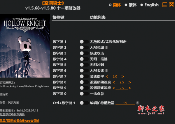 空洞骑士十一项修改器由作者“风灵月影”制作,空洞骑士是一款传统2D动画风格的银河恶魔城类型动作游戏,修改器具有无限灵魂,快速攻击,无限二段跳,无限冲刺,无限金钱,一击必杀等十一项功能,喜欢的玩家千万不要错过哦。