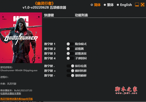 幽灵行者五项修改器由作者“风灵月影”制作,幽灵行者是一款有着赛博朋克风格的第一人称视角游戏,修改器具有隐身模式,超级跳,子弹时间,瞬间转移等五项功能,喜欢的玩家千万不要错过哦。 功能按键 数字键 1 – 隐身模式 数字键 2 – 超级跳 数字键 3 – 超级速度 数字键 4 – 子弹时间 数字键 . – 保存位置 数字键 + – 瞬间转移 数字键 – – 撤销瞬移 使用方法 1.解压文件 2.启动游戏 3.启动修改器 幽灵行者 修改器 隐身模式 超级跳