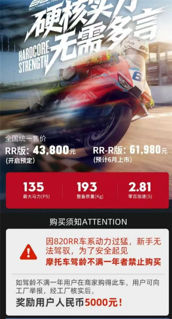 目前,在张雪机车ZX820RR车型页面,购买须知仍有显著提醒:“因820RR车系动力过猛,新手无法驾驭,为安全起见,摩托车驾龄不满一年者禁止购买,举报违规者可奖励5000元。”