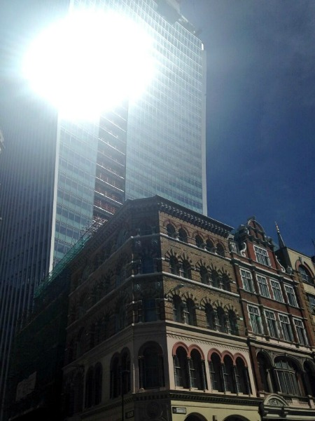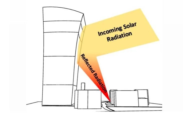 2013 年夏末,当大楼尚在施工阶段时,一场意想不到的危机开始显现。在 8 月底至 9 月初的几周内,由于太阳在天空中的特定高度角,大楼南向的巨大凹面玻璃幕墙开始扮演起汇聚太阳光的角色 。