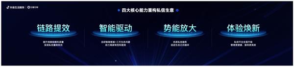 为帮助商家在抖音做好、做大生意,抖音生活服务聚焦私信产品全链路,建设四大核心能力:链路提效、智能驱动、势能放大、体验焕新。