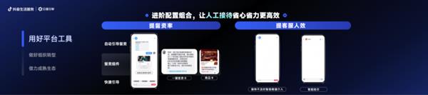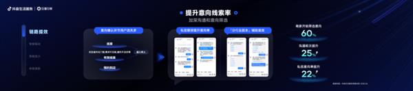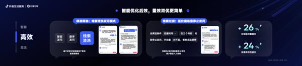在后效优化方面,通过私信多轮沟通实现获取客资和意向筛选,并通过分行业剧本等能力帮助商家提效,目前已有超60%商家选择前置做好意向筛选,实现沟通轮次提升25%、私信意向率提升22%、销售力上翻的好成绩。