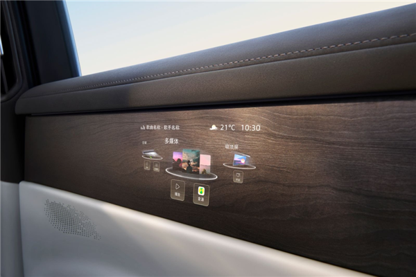 看上去就像是直接在木板上操作的既视感,主要用于调节后排温度、座椅及冰箱,并接入了外后视镜的盲区摄像头画面以辅助开门观察,可以说这块屏幕是这次ID.ERA 9X产品功能点上最大的亮点所在。